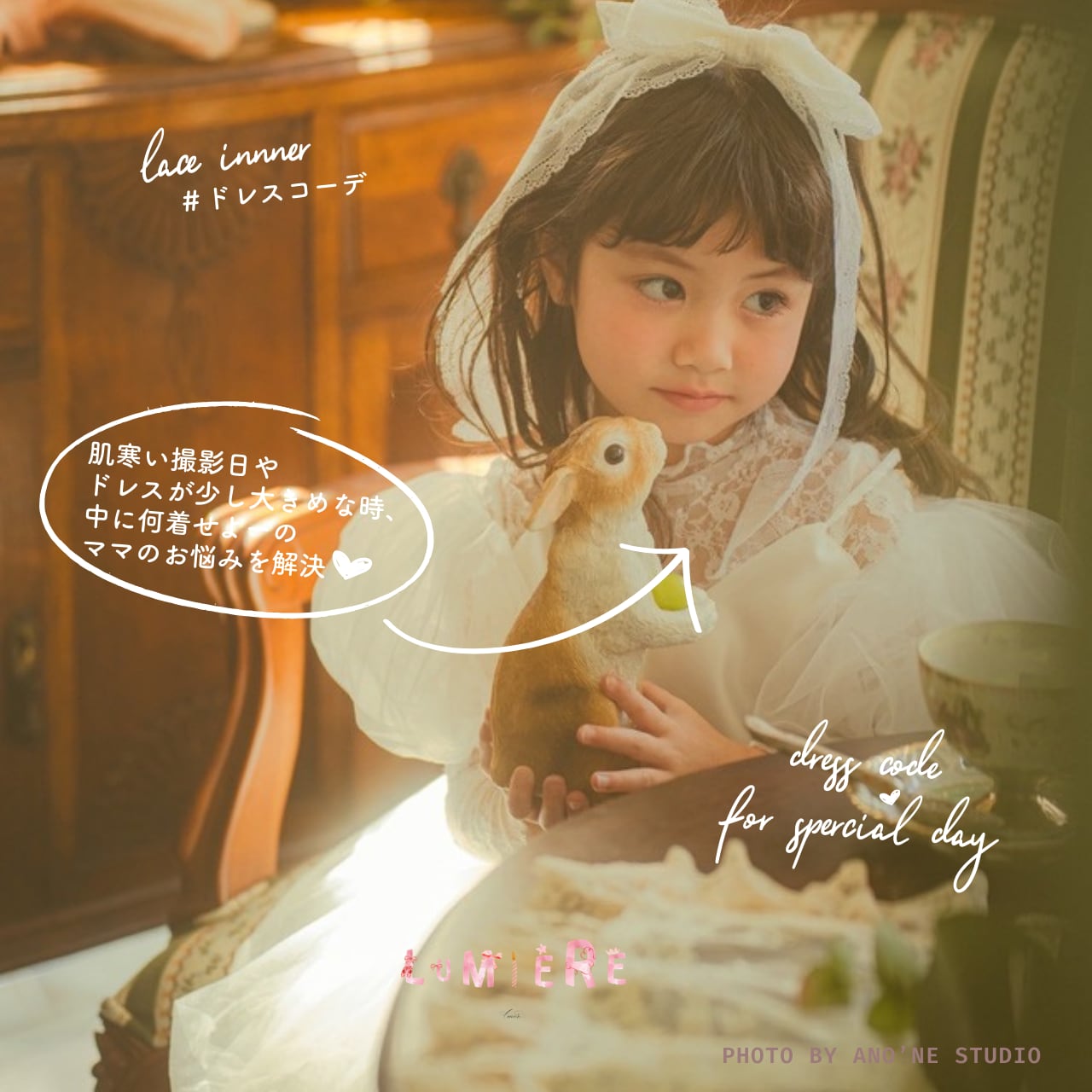 発表会やフォトスタジオでの撮影はもちろん、普段のお出かけ着のインナーとしても大活躍。